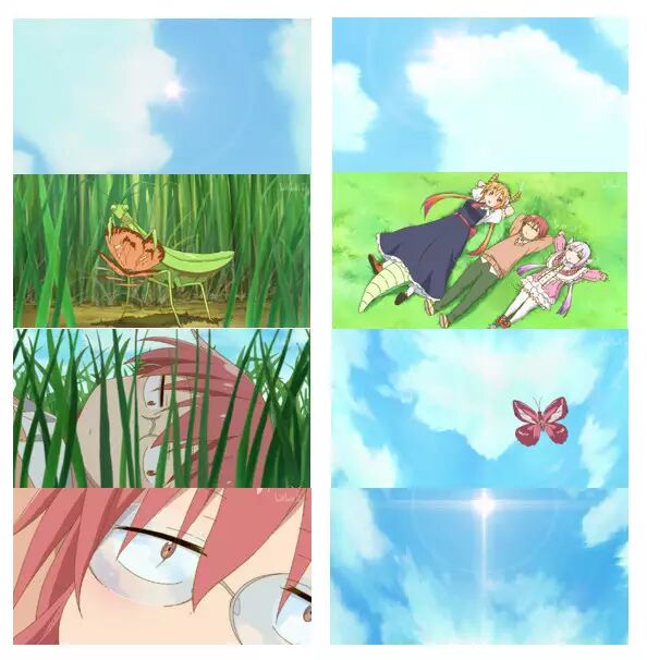 镜头概述:托尔和康纳一番激烈的玩耍之后,刚刚开始与龙共同生活的小林心中产生了疑虑:即使她们想要毁灭世界也是轻而易举的吧。然而看到模仿自己疲惫模样的两只龙,小林心中的疑虑立刻就被打消了。然而看着玩累的托尔和康纳,小林的这个恐惧立刻就被打消了。小林的心理变化、蝴蝶和太阳三条线索构成平行蒙太奇。