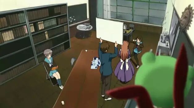 开始我记起了山本宽在《凉宫春日的忧郁》中,在Some day in the rain这一话里充满窥视意味的镜头,虽然很相似,但“窥视”这一层语义是由镜头前失焦的遮挡物赋予的,因为盗摄者需要掩护他的镜头。因此我们现在讨论的情况并不一样。
