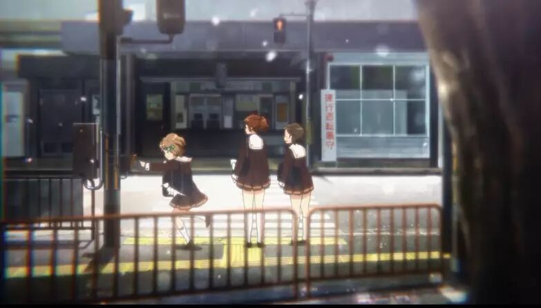 象征性意味的平行蒙太奇的技巧在于,选择在剧情下合理的事物作为主线的象征符号。武本监督显然非常偏爱昆虫,因为我们还记得他在《吹响上低音号2》第2话中,对于死鱼眼丽奈和甲虫的含蓄演出,所以可能并不是所有的观众都看出了丽奈和甲虫的联系。蝴蝶危在旦夕,太阳躲到了云翳里,一开始看上去,这些画面也没什么关联,然而在小林打消疑虑之后,武本监督巧妙地利用小林的眼镜作为道具,直接在观众潜意识里构建了天空与小林之间的联系——仰望天空的小林瞳孔中所映照的世界,未来是充满阳光的。
