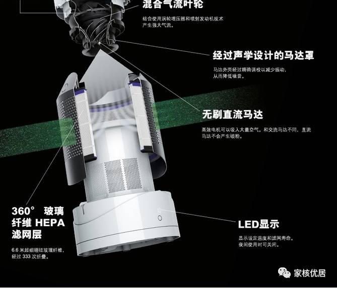 戴森空气净化暖风扇HP01传承与戴森的AM系列无扇叶风扇,它的结构和理念全部继承于冷风型、冷暖型无扇叶风扇,一台夏能乘凉、冬可取暖、雾霾天还能够净化空气的HP01。一台机器解决三种需求。