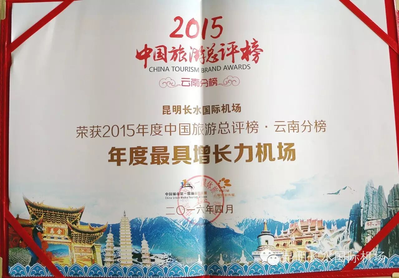 近日,由中国城市第一媒体“旅游联盟”主办,“云报旅游传媒”联合丽江市旅游发展委员会共同承办的“2015年度中国旅游总评榜颁奖典礼”在云南丽江举行,来自全国获奖的景区、酒店、机场、航空公司、旅游管理服务机构行业代表出席了此次盛会。颁奖典礼上,昆明机场因其卓越的服务品质和加速增长的航班架次、旅客吞吐量,荣膺2015年度“最具增长力机场”奖项。