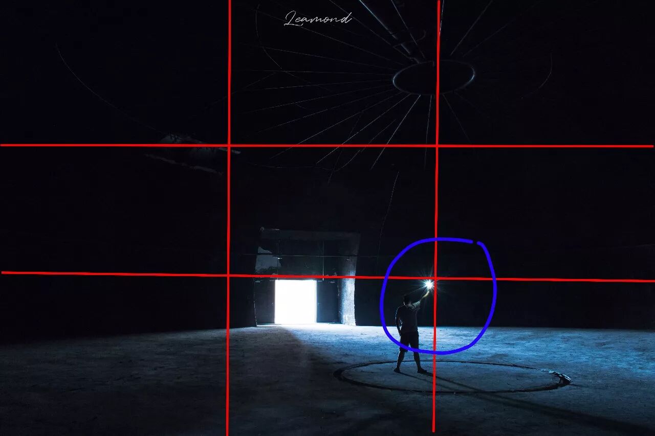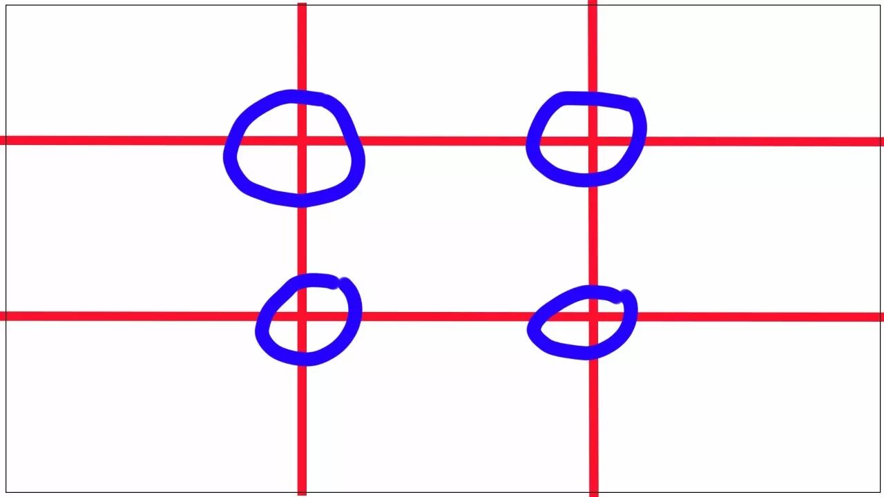 三分构图法也称作井字构图法,是一种在摄影、设计等艺术中经常使用的构图手法,应用此方法,我们需要将场景用两条竖线和两条横线均匀分割,这样可以得到4个交叉点,将画面的主体重点放置在4个交叉点中的一个即可。