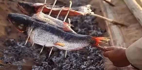 可见当地人烹饪烤大头鱼,向往来的客人兜售,